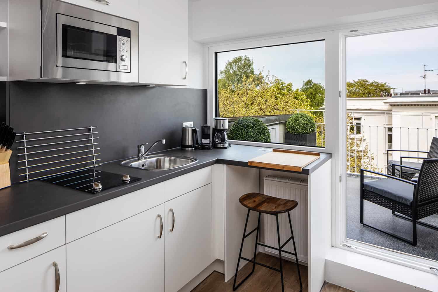 Offen gestaltete Küche mit Blick über Hamburg